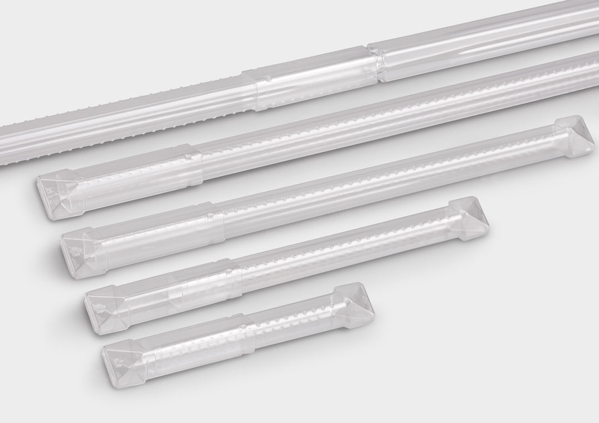QuadroPack TipLine is ideal for longer instruments. Thanks to its tapered ends, this square protective/packaging tube reduces the risk of the contents puncturing the packaging. Alternatively, your products will be optimally protected inside our tried-and-tested TwistPack Plus, BlockPack, and TelePack plastic tubes – during both storage and transport.
