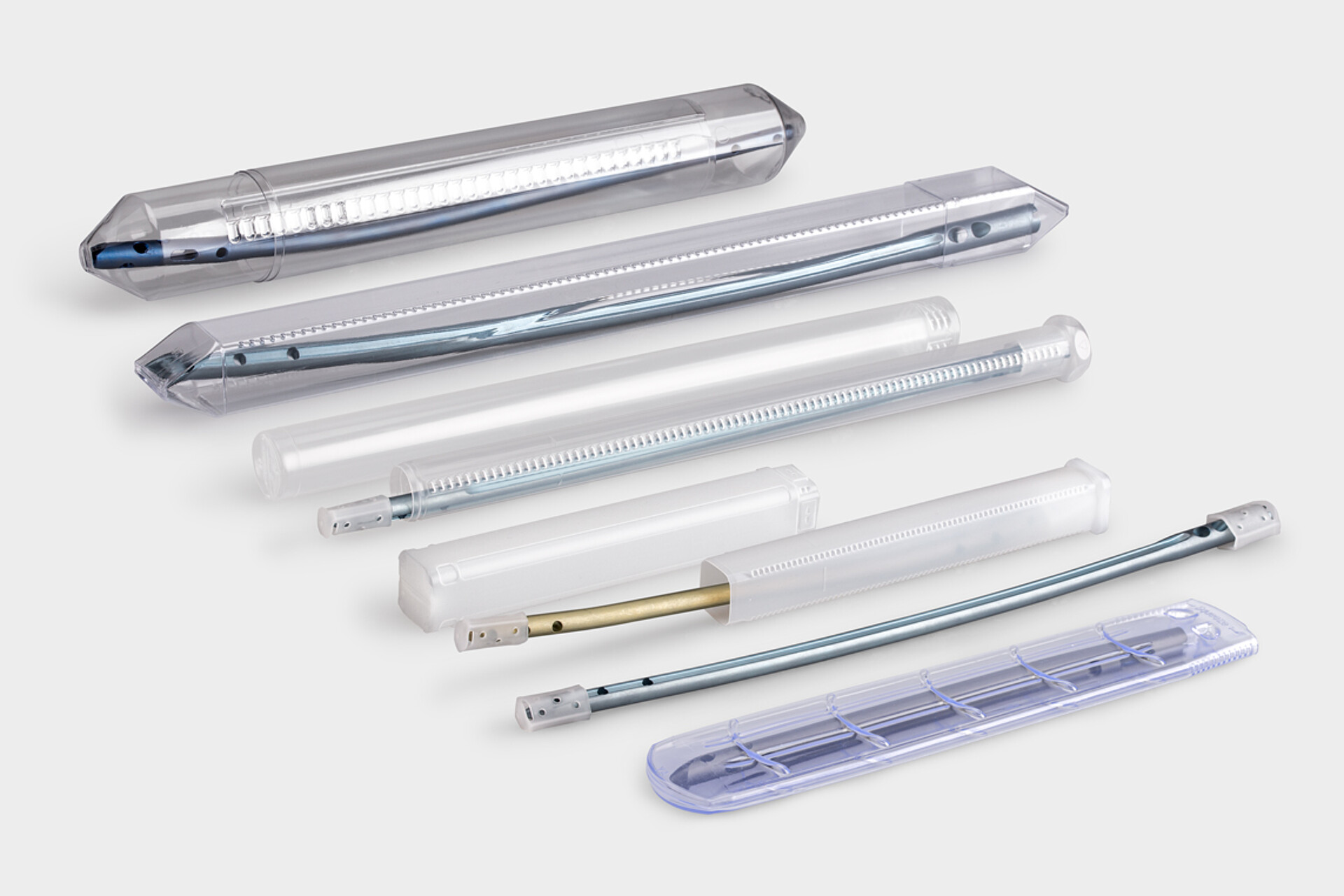 You can rely on our versatile and proven packaging solutions. Like TipTube, for example. This length-adjustable, high-quality, individual packaging reliably protects bone pins of various geometries, such as femoral pins, humeral pins, and tibial pins, all the way to the operating theater. TipTube consists of an inner and an outer part that are pushed into each other. By rotating the two individual parts in opposite directions, the bayonet lock engages. This secures both ends of the bone pin in the tips of the TipTube. The resulting “floating storage” ensures minimal contact with the packaging.